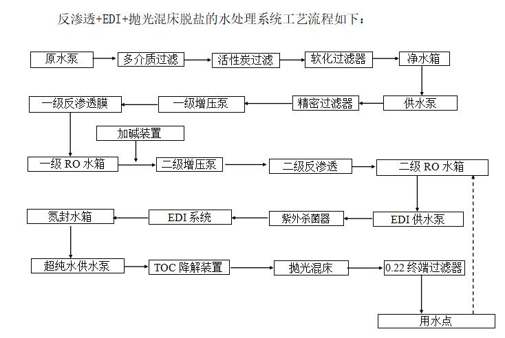 為保證關(guān)鍵設(shè)備反滲透裝置的長(zhǎng)期可靠穩(wěn)定運(yùn)行,則必須設(shè)置預(yù)處理系統(tǒng),滿足反滲透膜(RO)進(jìn)水指標(biāo):濁度<0.5NTU、SDI<4、余氯<0.1ppm。根據(jù)原水水質(zhì),預(yù)處理系統(tǒng)由多介質(zhì)過(guò)濾器、活性炭過(guò)濾器、加藥系統(tǒng)及相關(guān)輔助設(shè)備組成。 反滲透+EDI+拋光混床脫鹽的水處理系統(tǒng)工藝流程如下: |